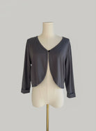 This charcoal cropped cardigan is the perfect lightweight layering piece. Featuring a flattering V-neckline and a single front clasp closure, it offers a clean, modern look with soft draping at the front. The 3/4-length sleeves and smooth, stretch-knit fabric make it both comfortable and versatile. Ideal for wearing over sleeveless tops or dresses, this cardigan adds just the right touch of coverage and sophistication to any outfit.