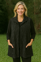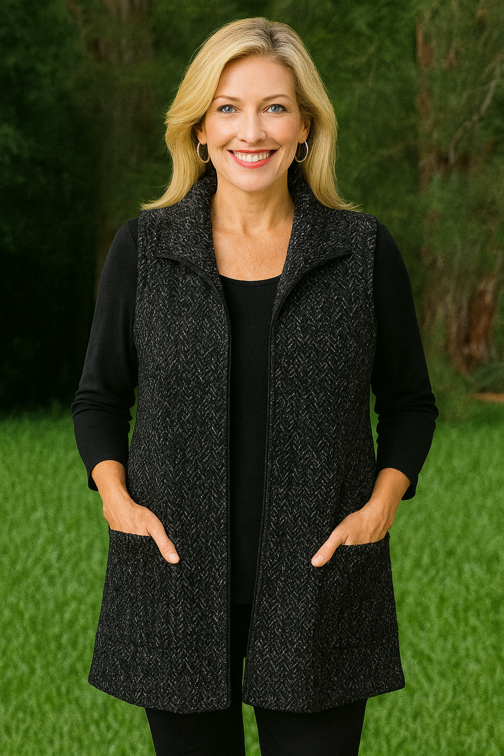 Features a front Black Zipper closure, sleeveless vest, and top underneath not included.