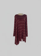 This cozy burgundy tunic features a subtle striped pattern and a flattering asymmetrical hemline for a modern, relaxed look. The soft, lightweight fabric drapes beautifully, offering both comfort and style. With its long sleeves and flowing silhouette, this top is perfect for layering or wearing on its own. Ideal for pairing with leggings or jeans, it’s a versatile piece that transitions effortlessly from casual daytime wear to a chic evening outfit.