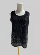 Shine with understated elegance in this Black Sequin Chevron Tank. Designed with a flattering scoop neckline and soft drape, this sleeveless top dazzles with rows of sequins arranged in a sleek chevron pattern. Perfect for adding a touch of glamour to your evening look—wear it under a blazer for a refined finish or pair it with sleek pants for a sophisticated night-out ensemble.