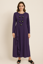 This is a long-sleeve, full-length dress designed with a smooth, elegant drape. It features a simple rounded neckline and a clean, fitted bodice that flows into a gently flared skirt. On one side, a cascading layered panel adds movement and visual dimension, creating a soft, fluid silhouette. The dress includes a long, statement necklace with large circular elements that complement the minimalist style. Overall, the design is refined, graceful, and ideal for both formal and semi-formal occasions.