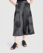 - Wide-leg palazzo silhouette creates an elongating, flowing line