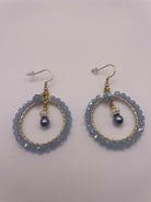 These charming earrings feature gold-tone hoops wrapped in shimmering faceted light blue beads that catch the light beautifully. At the center of each hoop hangs a delicate drop accent, combining a clear faceted bead with a glossy blue pearl-like bead. The mix of sparkle and soft sheen creates a feminine and elegant look, perfect for both casual and dressy occasions.