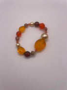 Warm and radiant, this bracelet brings the colors of fall to life. Featuring large amber-style beads in golden yellow and burnt orange tones, paired with faceted crystal beads and accented by luminous gold-toned pearls, it offers a bold yet elegant look. The mix of textures and hues creates a vibrant statement piece, perfect for adding a pop of color to any outfit. Stretch design ensures a comfortable fit for everyday wear.