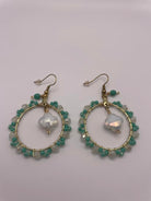 These delicate earrings feature gold-tone hoops adorned with small turquoise and frosted white beads intricately wrapped around the frame. At the center of each hoop hangs a faceted iridescent bead in a floral-like shape, adding a touch of shimmer and movement. Lightweight and playful, these earrings offer a bohemian yet elegant vibe, perfect for casual outfits or summer-inspired looks.