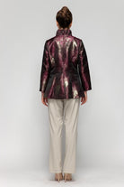 Make an elegant statement with this luxurious metallic brocade jacket, designed in rich tones of plum and gold. The stand collar and sculpted silhouette add a touch of sophistication, while the large covered buttons create a timeless, tailored finish. Perfect for special occasions or evening outings, this jacket brings instant polish and shine to any look.