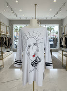 Make a statement with this Jeff Lieb designer tunic, featuring a striking modern art face graphic on crisp white fabric. Known for his bold and creative style, Jeff Lieb brings wearable art to life with this unique piece. The tunic offers a relaxed, flattering fit and three-quarter sleeves accented with black stripes, combining comfort and creativity in perfect balance.