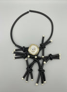 Sculptural and avant-garde, this Contemporary Pearl Edge Necklace by Jeff Lieb showcases a bold, artistic design handcrafted in the USA. The piece features matte black sculpted elements tied into a dynamic, knotted formation, each tipped with elegant pearl accents for a striking contrast of texture and tone.