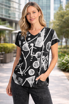 The modern abstract print adds a stylish, contemporary touch, while the curved hemline creates a soft, feminine finish that pairs perfectly with both casual and polished looks. Crafted from a smooth stretch fabric, this top offers all-day comfort with a lightweight feel.