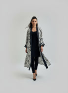 Elevate your look with this elegant Midnight Vine Kimono Jacket, featuring a bold abstract vine print in black and white. The silky black shawl collar and flowing silhouette add an air of sophistication and ease, perfect for both casual and dressy occasions. Lightweight and effortless, this statement piece layers beautifully over your favorite basics or evening wear.