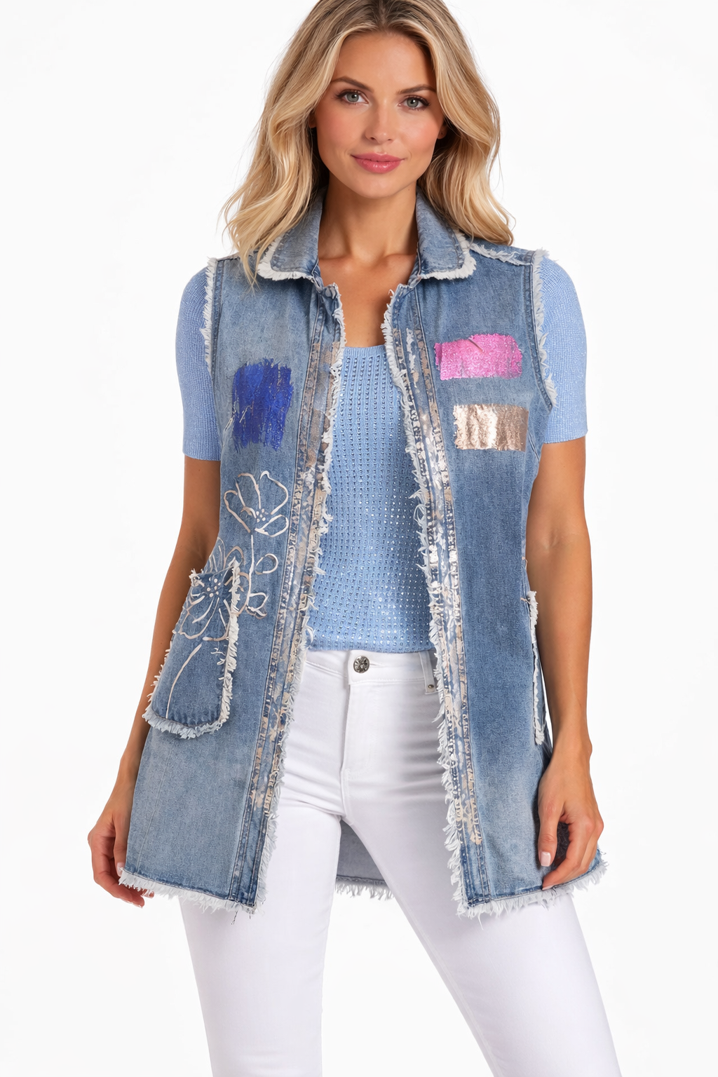Add a touch of artistic charm to your everyday wardrobe with this stunning patchwork denim vest. Designed with soft washed denim and accented with colorful patch panels and delicate embroidered detailing, this longline vest brings effortless boho elegance to any outfit. The open-front silhouette layers beautifully over tees, blouses, or lightweight knits, while the frayed edges and front patch pockets add a relaxed, fashion-forward finish.