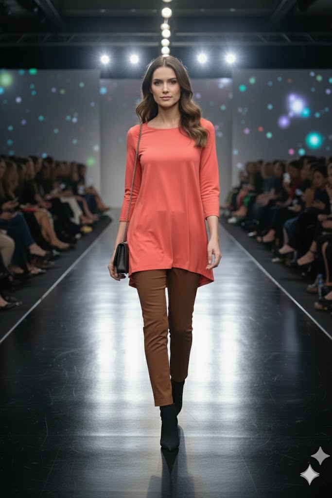 A vibrant coral tunic top designed with a clean, modern silhouette and a beautifully fluid drape. This piece features a classic round neckline and long sleeves, creating a simple yet elegant shape that flatters a variety of body types. The hem falls gracefully below the hips, offering comfortable coverage and a smooth, elongated look.