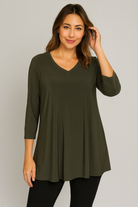 A flowy V-neck tunic designed with a relaxed, A-line silhouette that drapes softly over the body. The three-quarter sleeves feature a semi-sheer shoulder inset that creates a subtle cutout effect, adding a touch of modern detail. Smooth, lightweight fabric enhances the easy movement and comfort of the piece, making it ideal for everyday wear or elevated casual styling.