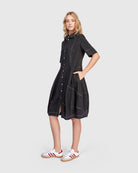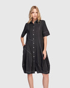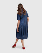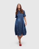 This casual version of the signature Wonderful Dress is made in a lightweight denim woven and has a foldover collar, full button placket, elbow length sleeves, and side pockets. A slim fit that flatters, with signature draping, denim seam detailing and pouf skirt to hold shape. Fitted at the bust.