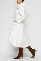 Designed with a wide collar and modern zip closure, this piece brings structure and edge to any look. The hi-low hemline adds a contemporary silhouette, while deep front pockets offer both function and flair. Crafted in a soft stretch fabric, it delivers ultimate comfort and graceful movement. Finished at a flattering midi length, this versatile layer transitions seamlessly from casual outings to elevated evenings.