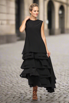 Designed with a sleek sleeveless bodice and a round neckline, this statement piece features cascading layered ruffles starting from the waist, adding dramatic texture and modern flair. Crafted from a high-quality fabric with a smooth finish, it offers both comfort and structure, making it perfect for formal occasions, evening events, or fashion-forward street style.