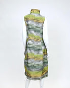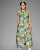 Make a bold statement in the IC Collection Sleeveless Zip-Front Dress, a modern piece that perfectly balances structure and softness. Designed in a contemporary abstract print with hues of green, gold, and graphite, this dress adds a dynamic touch to any wardrobe.