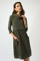 This bubble jacquard and silky knit dress is an impeccable fusion of luxury and glamour. The shirring at the empire waist delicately accentuates the cocoon silhouette, while the three-quarter sleeves exude a refined charm. Front pockets add a touch of practical chic, complementing the stand collar with a beautiful back button opening.