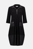 This solid silky knit dress highlights contemporary elegance with its chic below-the-knee cocoon silhouette. The funnel collar in memory fabric, adorned with a sleek zipper, adds bold flair, while three-quarter-length sleeves enhance its polished design. Thoughtful details, including a band at the hem and applied front pockets—one featuring a zipper accent—lend an air of sophistication to the garment.