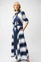 Discover effortless elegance with this Joseph Ribkoff striped cotton shirt dress. Crafted from 100% premium cotton, this versatile midi dress combines timeless nautical-inspired stripes with a flattering fit-and-flare silhouette that moves beautifully with you.