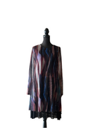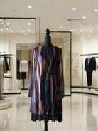 Sleek A-line silhouette with a classic round neckline. Features sheer mesh sleeves and a fully lined body, with a touch of black lining peeking out for added dimension. The fabric showcases a vibrant wavy print in bold shades of cobalt, hot pink, and emerald, set against a dark, painterly background for a striking contrast.