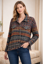 Make a bold statement with the Frank Lyman Black/Orange Weaved Jacket – a stunning designer piece that combines sophisticated texture with eye-catching color contrast.