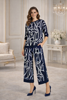 Imagine starting your day feeling confident and put-together. This Frank Lyman top delivers that effortless elegance you've been searching for. The navy and white color palette pairs beautifully with your favorite bottoms—from tailored trousers to dark denim or sleek skirts. The abstract pattern disguises any imperfections while the strategic side details create a lengthening, slimming effect.
