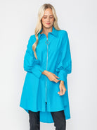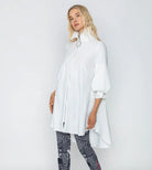 Refined and architectural, this sculpted zip-front jacket blends modern minimalism with artistic detail. Designed with softly structured fabric, it features ruched sleeves that create volume and movement, a tailored collar, and an elegant high-low hem. Discreet side pockets add practical ease without compromising the clean silhouette.