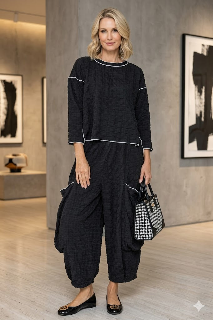 The IC Collection Bubble Check Detail Top is a beautifully textured piece that pairs bold pattern with the comfort IC Collection is known for. The bubble check weave adds dimension and depth, making this a statement top you'll reach for season after season. Works beautifully as part of a coordinated set or as a standalone piece.