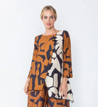 Modern, artistic, and effortlessly refined, this abstract print tunic brings a unique sense of style to any wardrobe. Featuring a fluid pattern of organic shapes, the design creates soft movement and visual interest while maintaining a clean, contemporary feel.