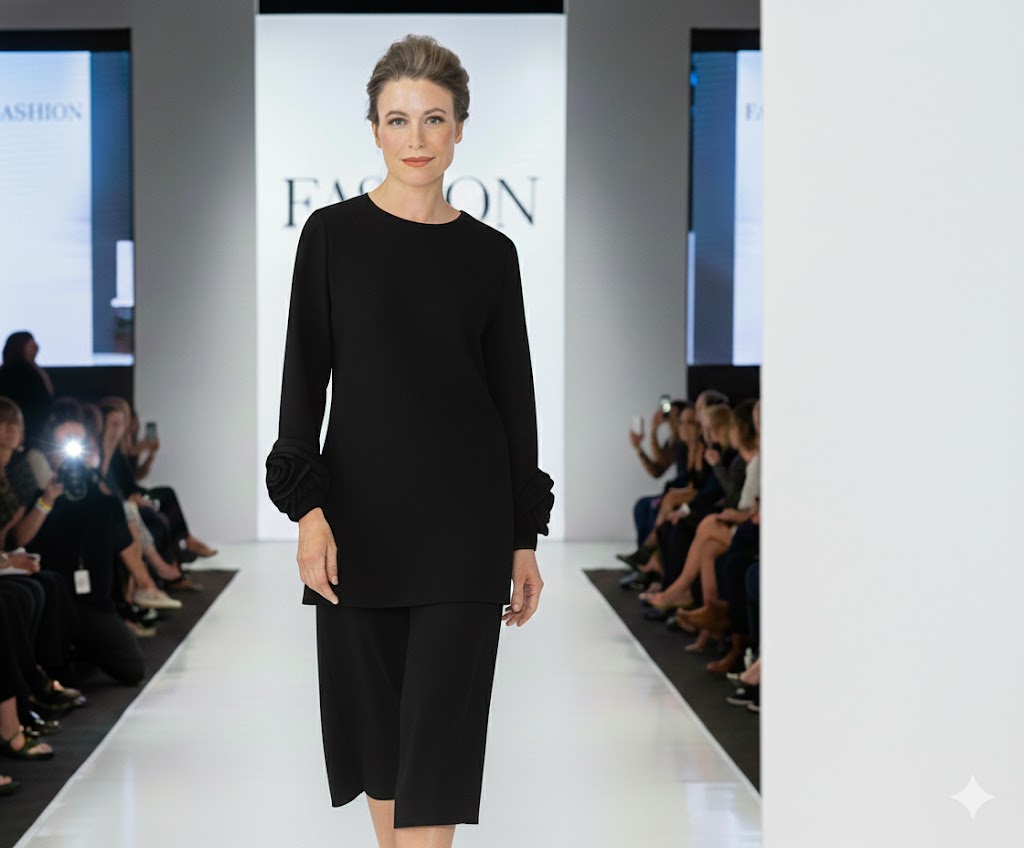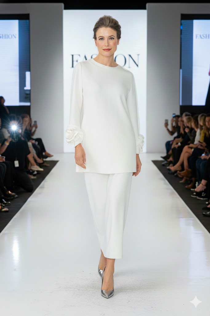 Elevate your wardrobe with this effortlessly chic Rose-Cuff Tunic, designed for the woman who loves timeless elegance with a modern twist. The clean, minimalist silhouette is beautifully complemented by the dramatic sculpted rose appliqués at each sleeve — a signature detail that adds sophistication and artistic flair.