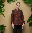 Add an artful twist to your fall wardrobe with the Terra Dot Mandarin Jacket. Designed with a modern Mandarin collar and a flattering A-line silhouette, this unique piece features a rich brown base adorned with bold circular motifs in deep orange—a striking nod to contemporary pattern play.