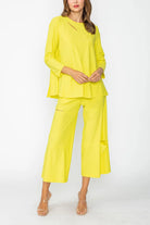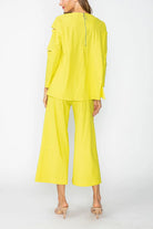 Bright, fresh, and effortlessly modern, this statement top brings a pop of sunshine to your wardrobe. Designed with a relaxed silhouette, it features a subtle angled slit at the neckline for a contemporary edge. The flowy shape drapes beautifully over the body, offering both comfort and sophistication, while the long sleeves with soft flare cuffs add movement and elegance.