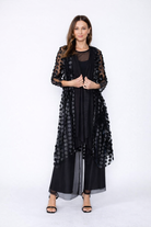 dd instant drama and elegance to any outfit with this sheer dot mesh duster jacket. Designed with a lightweight, flowy silhouette. The open-front design and longer length offer effortless sophistication, making it perfect for evening wear, special occasions, or elevated everyday styling.