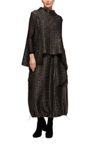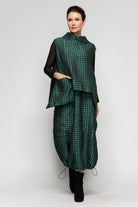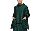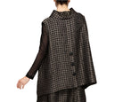 Make a bold statement with this textured asymmetrical vest in rich teal or taupe. Featuring a modern high neckline and a dramatic, angular hemline, this layered piece brings artistic structure to your wardrobe. A large front pocket adds both functionality and flair, while the sleeveless design layers effortlessly over fitted tops.