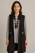 Elevate your layering with this sophisticated sleeveless tailored vest. Designed in a sleek fabric, it features clean, elongated lines that create a refined silhouette. The notched lapel adds a polished touch, while the gold-tone zip pockets bring a modern, functional accent.