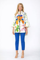 Make a bold, artistic statement with this vibrant floral zip-front jacket. Featuring a striking iris-inspired print layered with playful paint-splatter details, this piece blends art and fashion effortlessly. The structured silhouette is balanced by relaxed bell sleeves, while the front zipper adds a modern, versatile touch—wear it zipped as a top or open as a lightweight jacket.