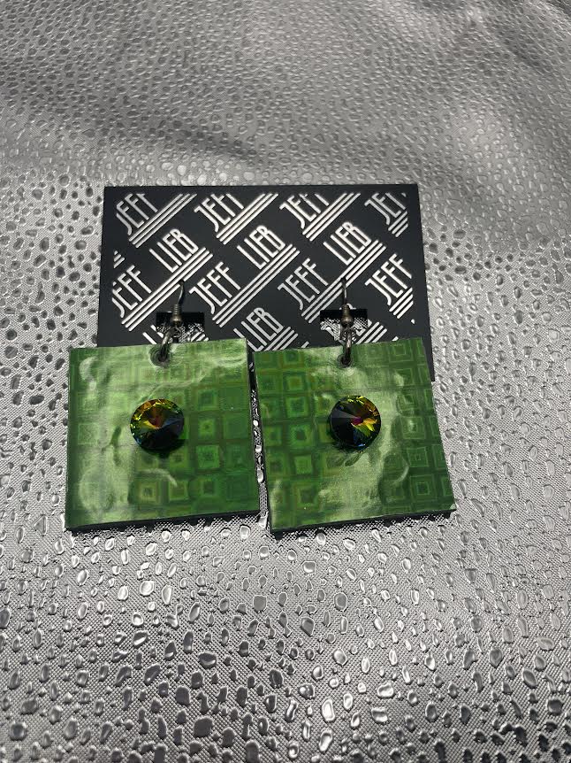 A bold fusion of artistry and elegance, these earrings are handcrafted with meticulous detail. Featuring a striking geometric green square base with a subtle textured pattern, each piece is adorned with a brilliant genuine Swarovski crystal at the center.