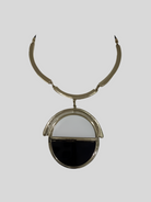This bold necklace features a structured gold-tone collar with a striking circular pendant. The pendant is divided into two halves, showcasing a clean black-and-white enamel design framed in polished gold. Its geometric, modern aesthetic makes it a versatile statement piece that pairs effortlessly with both casual and formal outfits. Perfect for adding a touch of contemporary elegance to your look.
