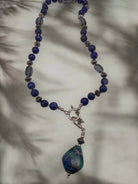 This handcrafted necklace features deep blue round beads paired with silver-tone spacers and uniquely shaped gray glass beads for added texture. At the center hangs a striking marbled teardrop pendant in shades of blue, green, and gray, giving it an artistic and one-of-a-kind look. Finished with a toggle clasp for secure closure, this necklace blends bold color with elegant details, making it a versatile accessory for both casual and evening wear.