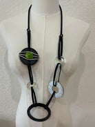 This long statement necklace combines bold geometric shapes with a modern artistic touch. Featuring a large round black pendant with a striking green center bead wrapped in silver accents, it’s complemented by a mix of textured silver-tone rings, clear acrylic circles, and sleek black elements. The design is linked together with black cord, giving it a contemporary yet versatile style. Perfect for adding a unique focal point to any outfit.