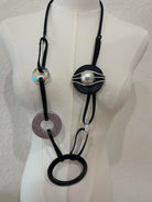 This bold statement necklace combines artistic design with contemporary flair. Featuring a mix of oversized geometric rings in black, silver, and clear accents, it is anchored by a large black disc centerpiece adorned with a luminous pearl-like bead wrapped in sleek silver detailing. The long black cord enhances its dramatic look, making it the perfect accessory for adding modern elegance to casual wear or a standout piece for evening outfits.