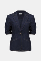 A sharp take on dressy denim, this short sleeve blazer features shank buttons at the sleeves and front, plus functional welt pockets for tailored polish.