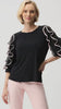 Elevate your everyday with this silky knit top, designed with three-quarter chiffon puff sleeves and playful ruffle accents. A contrast georgette binding adds texture, while the crew neck keeps it classic.