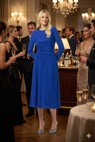 This sparkle knit dress gleams with its flattering fit-and-flare design that falls gracefully down the silhouette. Long sleeves and elegant front draping add a touch of glamour, perfect for making a statement.