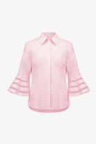 This stretch viscose and nylon blouse features a straight-fit silhouette with bell sleeves accented by organza inserts. The crewneck design and elegant sleeves make this unlined blouse perfect for a polished yet relaxed look.