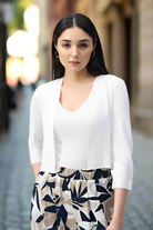 Add a little charm to your dresses with this sweater knit cover-up, adorned with pearl ornaments at the cuffs. Its open-front design, shorter length, and three-quarter sleeves, give you just the right amount of coverage while maintaining your flawless style.