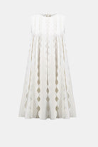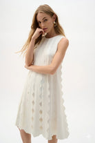 The sleeveless A-line silhouette creates a universally flattering shape that skims the body gracefully from shoulder to hem. The classic scoop neckline frames the face beautifully and offers versatile styling options for layering or accessorizing. What truly sets this dress apart is the stunning 3D scallop appliqué detailing that adorns the garment throughout, creating dimensional texture and visual interest that catches the light with every movement.