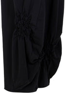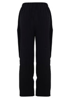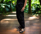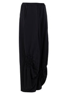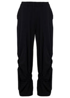 These relaxed-fit black pants offer effortless style with an edge. Designed with subtle ruching details along the legs, they bring texture and dimension to a classic silhouette. The lightweight fabric drapes beautifully, while the gathered accents add a touch of uniqueness and movement. Perfect for casual wear or elevated layering, they pair seamlessly with everything from tanks and tees to statement tops.