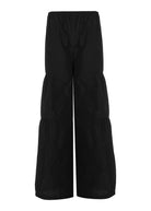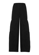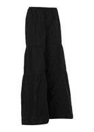 These high-waist pants feature dramatic wide legs that add a touch of glamour and graceful movement, enhanced by elegant tiered gathered seams. Crafted from crisp polyester with a windbreaker texture, they offer a comfortable pull-on stretch waistband and a full-length silhouette for effortless style.